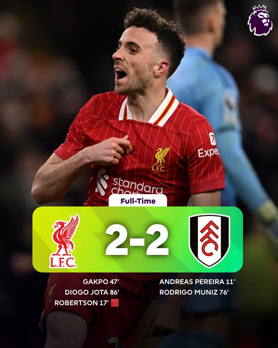 A l'Emirates, les Gunners ont été tenus en échec (0-0) par Everton après un match relativement terne. Du côté d'Anfield, le spectacle a été au rendez-vous puisque les Reds, réduits à dix après l'expulsion de Robertson dès la 17e minutes, ont réussi à revenir deux fois au score (2-2) face à une formation de Fulham très joueuse et qui s'est installée dans la première partie du classement. Chelsea, qui joue dimanche à domicile, pourrait revenir à deux points de Liverpool en cas de victoire contre Brentford.