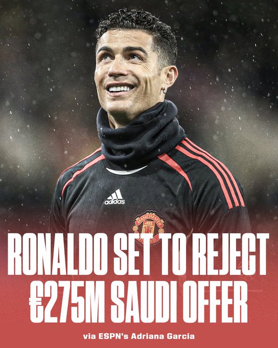 Courtisé par un club d'Arabie Saoudite, qui était prêt à lui verser un incroyable salaire de 275 millions d'euros sur deux ans, Cristiano Ronaldo a choisi de décliner l’offre pour des raisons sportives.