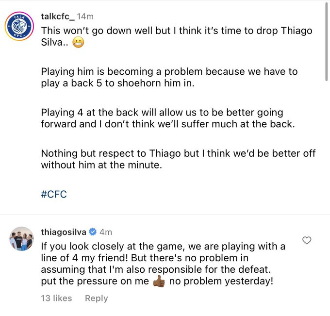 « Il est temps d'écarter Thiago Silva. On doit jouer à cinq derrière pour l'inclure », s’est plaint un fan, dont le message n’a pas échappé au défenseur central qui lui a sèchement répondu. « Si tu regardes le match attentivement, on joue avec une défense à quatre mon ami ! Mais je n'ai aucun problème pour assumer que je suis aussi responsable de la défaite. Mettez la pression sur moi. Il n'y a pas de problème », a réagi l’ancien joueur du Paris Saint-Germain, apparemment trop tendu pour ignorer cette critique. Le Brésilien ferait pourtant mieux d’assumer sans broncher, à l’image de son coach Mauricio Pochettino qui accepte les sifflets.