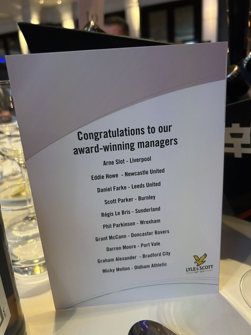 At the Northern Football Writers Association awards do. Arne Slot has won manager of the season. He was scheduled to be here but is not