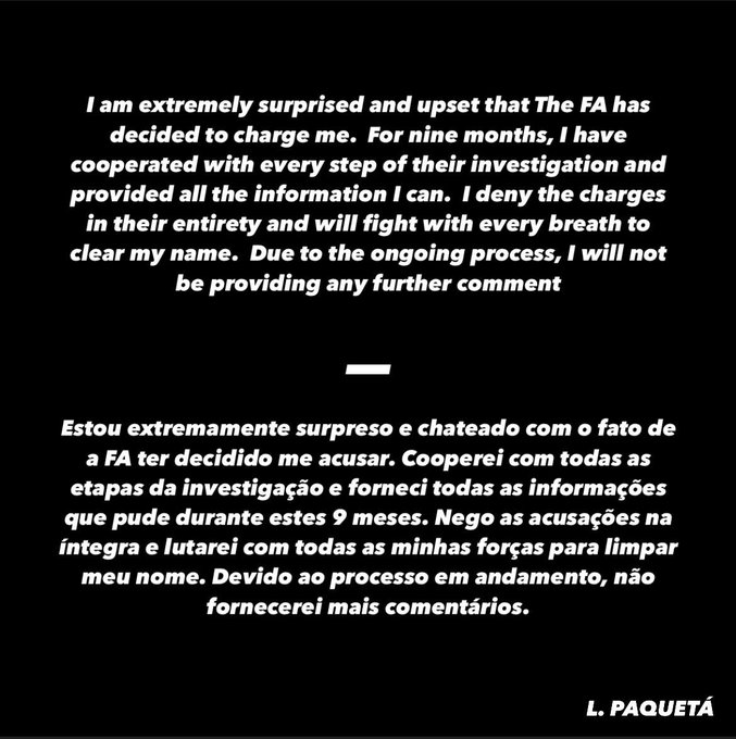 « Je suis très déçu et surpris par la décision de la FA de m’accuser. Depuis neuf mois, j’ai coopéré à chaque niveau de l’enquête et je leur ai fournis toutes les informations que je possède. Je démens les accusations dans leur totalité et je vais me battre jusqu’à mon dernier souffle pour laver mon nom. En raison de l’enquête en cours, je ne ferai plus d’autres commentaires à l’avenir », a fait savoir le joueur brésilien, qui a désormais 10 jours pour apporter sa défense définitive dans ces accusations, qui ont en effet mis très longtemps à se concrétiser puisque les faits datent d’il y a désormais un an.