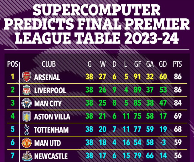 Le super ordinateur précise notamment qu'Arsenal gagnera encore 22 points en championnat, avec 7 victoires lors de ses 10 dernières rencontres. Les Gunners auraient donc un total de 86 points, soit le même qu'annoncé pour Liverpool. Cela se jouerait donc à la différence de buts, qui serait favorable à Arsenal, avec un +7 au compteur sur les Reds. Le troisième serait donc Manchester City, qui finirait à deux petits points d'Arsenal et Liverpool. Il ne s'agit là que de prédictions mais nul doute que ce classement final ferait bien plaisir aux supporters d'Arsenal, qui n'ont plus connu la saveur d'un titre en Premier League depuis la saison 2003-2004. Cruel en revanche pour Jürgen Klopp et ses hommes. Concernant les Skyblues, ils perdraient leur couronne. Ils savent donc ce qui leur reste à faire pour inverser la tendance et faire mentir les pronostics, pour le plus grand plaisir des fans et observateurs. Lors de la prochaine journée de championnat, Arsenal recevra Chelsea, Manchester City ira à Brighton et Liverpool jouera le derby face à Everton à Goodison Park.