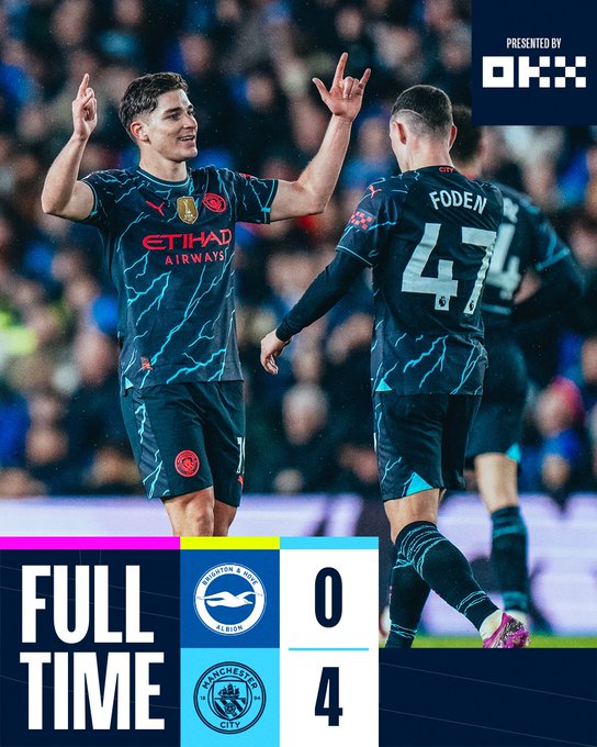 Buts : De Bruyne (17e), Foden (26e, 34e) et Alvarez (62e) pour Manchester City.