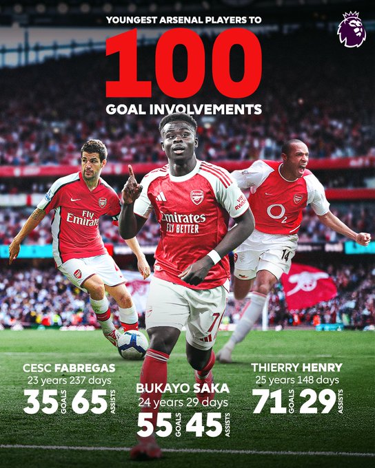 The second-youngest player to reach 100 goal involvements for @Arsenal 😮 Bukayo Saka 🌟