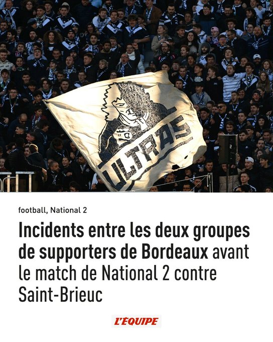 Des incidents entre les UB87 et la North Gate, deux groupes de supporters de Bordeaux, ont eu lieu ce samedi avant le match de N2 contre Saint-Brieuc. ➡️ l.lequipe.fr/rU