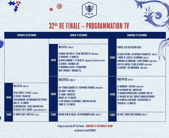 On connaît 𝐥𝐚 𝐩𝐫𝐨𝐠𝐫𝐚𝐦𝐦𝐚𝐭𝐢𝐨𝐧 𝐓𝐕 𝐝𝐞𝐬 𝟑𝟐𝐞𝐬 de finale 📺 🎬 On démarre le vendredi 20 décembre à 20h45 avec un multiplex de 6 matchs ! 🔚 On termine en beauté dimanche avec le choc RC Lens 🆚 PSG (21h00 sur @beinsports_FR)
