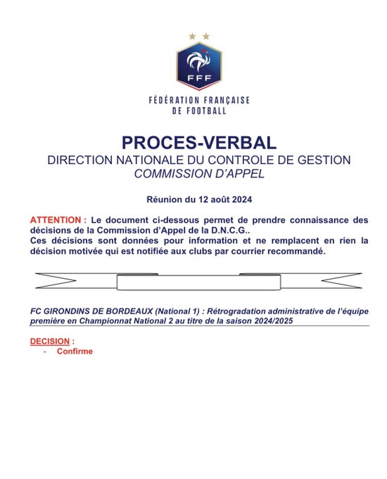 La rétrogradation des @girondins en N2 confirmée en appel ! #FCGB #Bordeaux