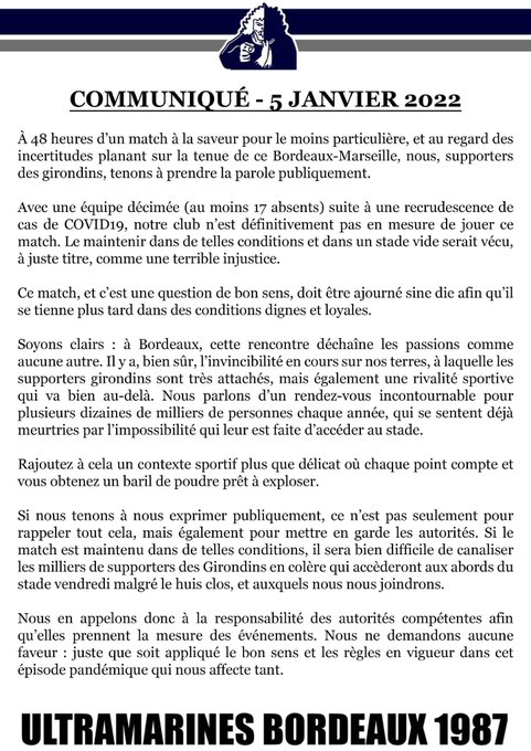 Les Girondins de Bordeaux l’ont annoncé officiellement ce mercredi, une demande de report du match contre l’Olympique de Marseille a été adressée à la Ligue de Football Professionnel, l’effectif bordelais comptant 17 joueurs positifs au covid. Et dans le même temps, le club au scapulaire précisant que la rencontre se jouera à huis clos si elle est maintenue vendredi soir au Matmut Atlantique. Du côté des supporters girondins, on exige que la Ligue décide rapidement du report de cette rencontre de la 20e journée de Ligue 1, et dans un communiqué, les UltraMarines Bordeaux 1987 vont droit au but et préviennent les autorités que la situation serait explosive autour du stade en cas de maintien de cette rencontre. L’association de supporters est directe, quitte à choquer un peu.