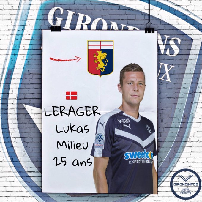 Pour le quotidien italien, cette offre convenait aux Girondins, qui attendaient néanmoins de trouver un remplaçant à Lerager avant de boucler le transfert. La situation a visiblement évolué au cours des dernières heures puisque ce mardi, le compte Twitter @Girondinfos affirme qu’un accord de principe a été trouvé entre Bordeaux et le Genoa pour le transfert du joueur de 25 ans.