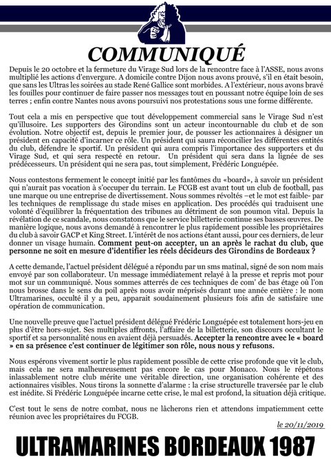 Communiqué Ultramarines Bordeaux 20/11/2019