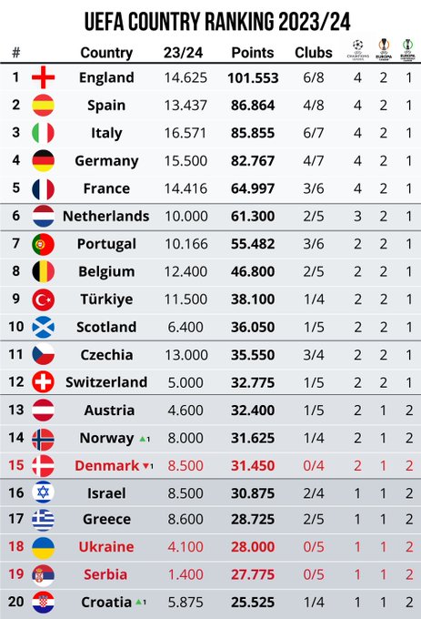 🏴 Rangers are still keeping Scotland above Czechia in Top 10 race! 🇨🇭 Switzerland on the brink of securing Top 12 spot, should finish above Austria! 🇭🇷 Croatia are Top 20 nation now, as Dinamo Zagreb moved them above Poland!