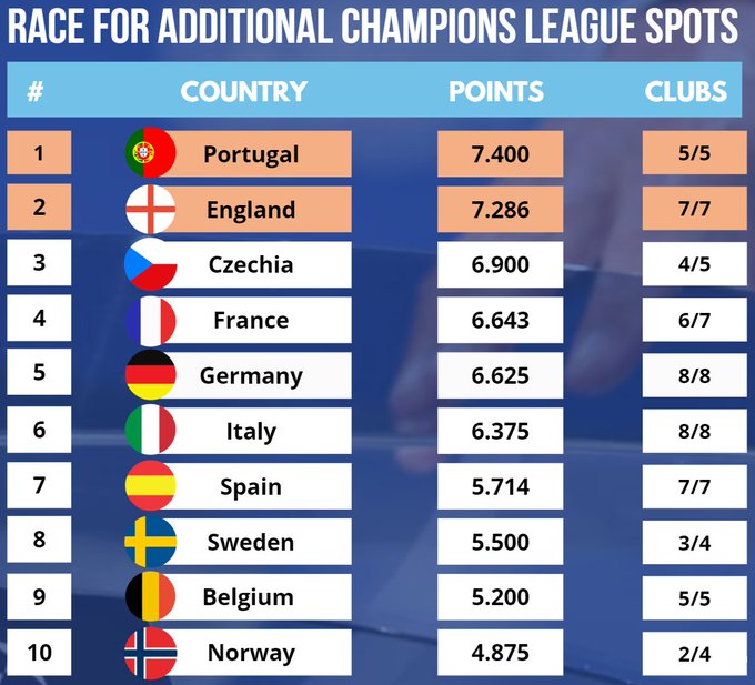 🚨 🏴 England are up to Top 2 spot, which secures an extra Champins League spot at the end of the season! 🇵🇹 Portugal are still holding 1st place! 🇨🇿 Czechia down to 3rd, 🇫🇷 France up to 4th! 🇪🇸 Spain moved up to 7th place tonight!