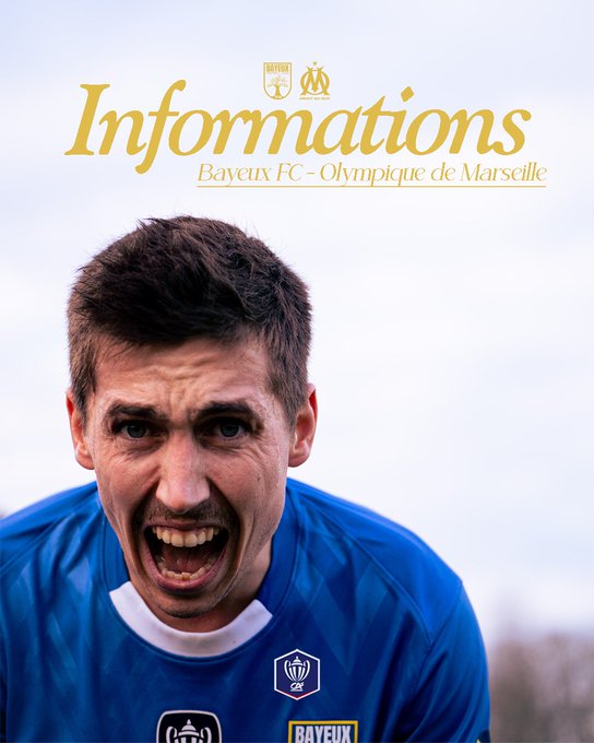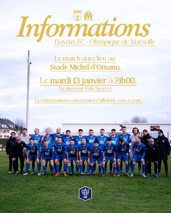 Des infos pour la réception de l’OM 👇 Le match aura lieu au Stade Michel d’Ornano à Caen, le mardi 13 janvier, à 21h00. 🏟️ Un rendez-vous à suivre sur les antennes de Bein Sports. 📺 #BFCOM #CoupeDeFrance #AllezBayeux🔵🟡