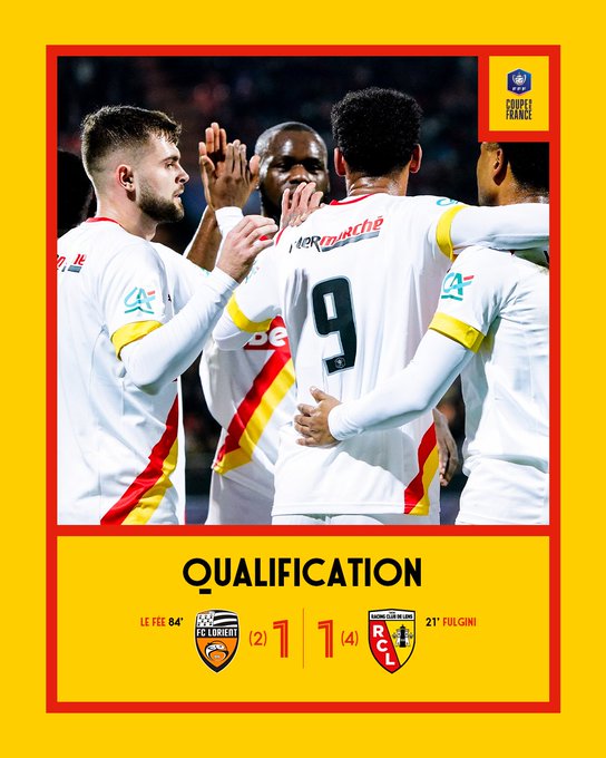 🏁 𝐃𝐢𝐫𝐞𝐜𝐭𝐢𝐨𝐧 𝐥𝐞𝐬 𝐪𝐮𝐚𝐫𝐭𝐬 💥 Au terme d'un sans-faute lors de la séance de tirs au but, le Racing se défait du piège lorientais et accède au prochain tour de la @coupedefrance 💪 #FCLRCL #CoupeDeFrance (1-1) @FCLorient : ❌🟢🟢❌ @RCLens : 🟢🟢🟢🟢
