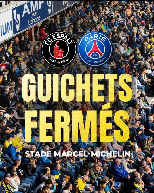 𝘾'𝙚𝙨𝙩 𝘾𝙊𝙈𝙋𝙇𝙀𝙏 ! Les joueurs du FC Espaly accueilleront ceux du @PSG_inside dans un #Michelin à guichets fermés ! Les places pour la rencontre du 16ème de finale de la @coupedefrance se sont arrachées en moins d'une heure 😊 Rendez-vous le mercredi 15 janvier à 21