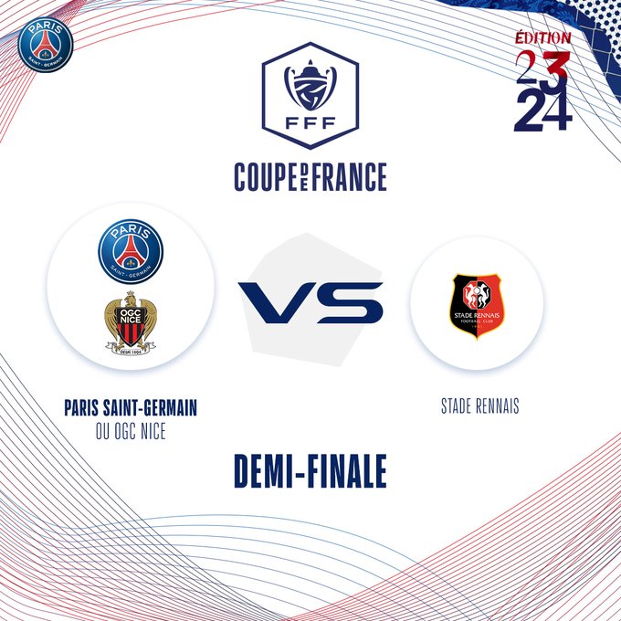 🆗🏆✅ En cas de qualification face à l'OGC Nice le mercredi 13 mars, le Paris Saint-Germain affrontera le Stade Rennais en demi-finale de la Coupe de France. 🔴🔵