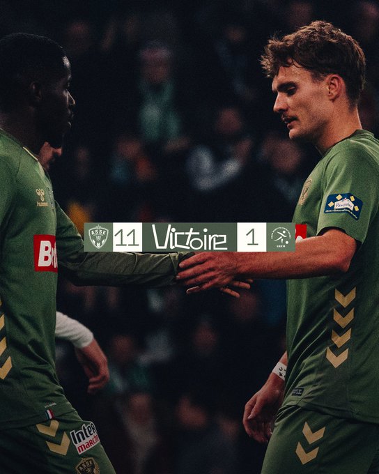 90e : Fin de soirée dans le Chaudron ! Les Verts se qualifient, mais tout l’honneur revient à Ecotay Moingt. À nos voisins, adversaires d’un soir : bravo, respect et MERCI POUR CETTE SOIRÉE ! 👏 💚 11-1 🔴 #ASSEUSEM