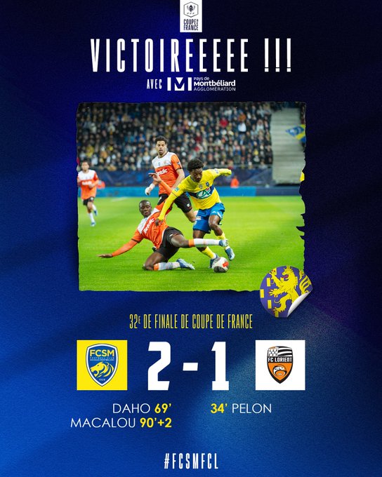 🏁 𝐐𝐔𝐀𝐋𝐈𝐅𝐈𝐂𝐀𝐓𝐈𝐎𝐍 𝐃𝐔 𝐅𝐂𝐒𝐌 !!! Dans un match de folie et portés par un public en feu, les Sochaliens font tomber le FC Lorient en Coupe de France et se qualifient pour les 16es de finale. BRAVO MESSIEURS 🫡 2⃣-1⃣ #FCSMFCL 🏆