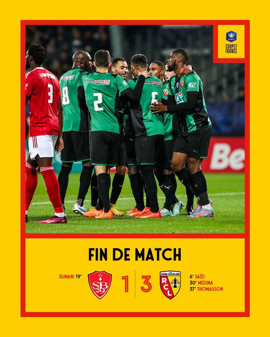 🏁 La qualif' pour le Racing ! À l'issue d'une rencontre qu'ils ont globalement maîtrisée, les Sang et Or valident leur billet pour les 8⃣es de finale de la @coupedefrance 💪 @SB29 1⃣-3⃣ @RCLens ⚽️ Saïd (5'), Medina (30'), Thomasson (37') #SB29RCL #CoupeDeFrance