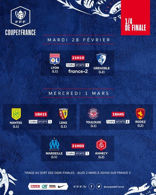 Voici la 𝗽𝗿𝗼𝗴𝗿𝗮𝗺𝗺𝗮𝘁𝗶𝗼𝗻 des 𝗾𝘂𝗮𝗿𝘁𝘀 𝗱𝗲 𝗳𝗶𝗻𝗮𝗹𝗲 de la #CoupeDeFrance 🏆 🔜 RDV les 28 février et 1er mars 🤩 📺 @francetvsport / @beinsports_FR