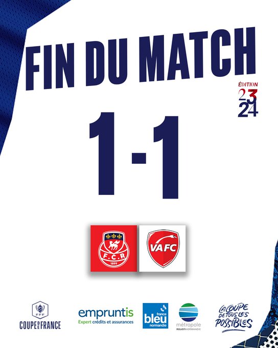 #FCRVAFC | 1️⃣-1️⃣ 90' Fin du temps réglementaire. Place aux tirs au but. Allez les Diables rouges !!! 🔴⚪ #TeamFCR #Rouen #Normandie