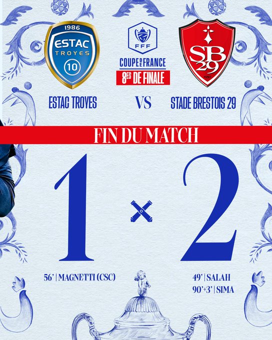 ⌚️| 90+5' 𝐓𝐄𝐑-𝐌𝐈-𝐍𝐄́ ! Au bout du temps additionnel le Stade Brestois s'impose au stade de l'Aube face à une valeureuse équipe troyenne et se qualifie en quarts de finale de la @coupedefrance pour la 3e fois de son histoire ⚔️ Bravo les gars ! ❤️🤍 #ESTACSB29 1️⃣-2️⃣