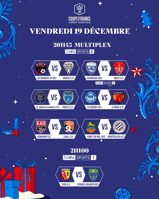 𝐋𝐀 𝐏𝐑𝐎𝐆𝐑𝐀𝐌𝐌𝐀𝐓𝐈𝐎𝐍 𝐄𝐒𝐓 𝐋𝐀̀ ! 🗓️😄 Sortez les agendas pour cocher les dates et heures des 32es de finale de la Coupe de France Crédit Agricole 🏆 Un grand week-end de football et de fête nous attend sur les antennes de @beinsports_FR et @francetvsport 📺🎄