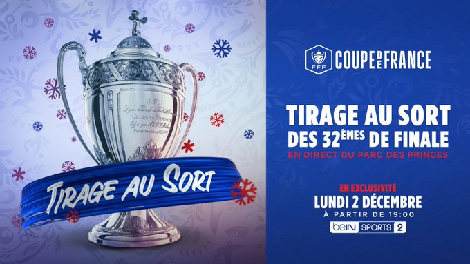 [#CoupeDeFrance] 🏆 Le tirage au sort des 32es de finale de la Coupe de France aura lieu ce lundi 2 décembre à 19h, en direct du Parc des Princes. Rendez-vous sur @beinsports_FR pour découvrir les affiches des rencontres prévues les 21 et 22 décembre. #TeamEAG #WarRaok
