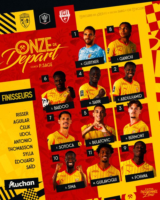 𝑯-𝟏 avant #RCLEFAFC à Bollaert-Delelis 🔴🟡 Voici le 𝒐𝒏𝒛𝒆 aligné par le coach Pierre Sage pour débuter ce 32e de finale de @coupedefranceCA face à l'Entente Feignies-Aulnoye FC. #FiersDEtreLensois