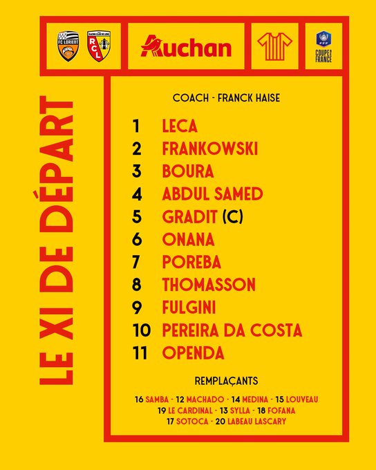H-1 avant #FCLRCL en #CoupeDeFrance 🔥 Voici 𝐥𝐞𝐬 𝐒𝐚𝐧𝐠 𝐞𝐭 𝐎𝐫 qui débuteront la rencontre face au @FCLorient ! ➡️ Un 1⃣1⃣ de départ marqué par la première titularisation d'Angelo Fulgini. #FierDEtreLensois