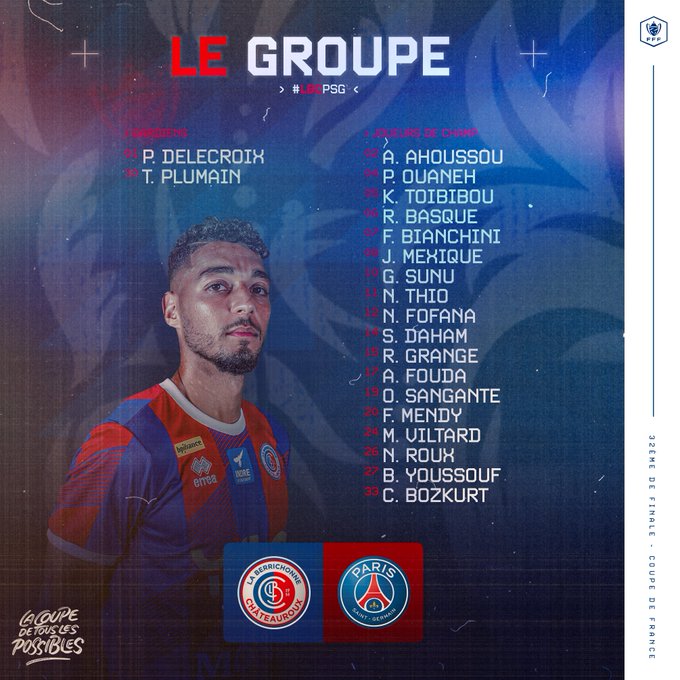 Quelques jours après avoir subi la foudre de Lens en L1, le PSG va tout faire pour se racheter contre une équipe de National en validant son ticket pour les 16es de finale de la Coupe de France. Mais pour cette rencontre, Christophe Galtier devra composer avec une cascade de forfaits. Vu que Messi, Neymar, Mbappé, Donnarumma, Verratti, Hakimi, Renato Sanches, Nuno Mendes ou Kimpembe sont absents. Autant dire que le PSG va devoir se qualifier avec ses jeunes, et certains titulaires comme Marquinhos ou Vitinha.