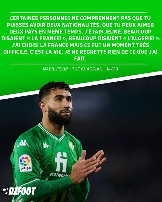 Lors d'un entretien accordé au Guardian, Nabil Fekir est revenu sans langue de bois sur son choix de sélection. Et pour lui, ce dernier a été très difficile, entre la volonté de son coeur et celle de son père. « Mon père est arrivé en France l'année avant ma naissance. Ma mère est algérienne mais y est depuis plus longtemps. Chaque année ou presque, j'allais en Algérie. Je me sens Français et Algérien. (...) Certaines personnes ne comprennent pas qu'on peut avoir la double nationalité, qu'on peut aimer deux pays à la fois. C'était difficile pour moi. J'étais jeune. Beaucoup de gens disent de choisir la France, beaucoup disent l’Algérie. Finalement, j'ai choisi la France mais ce furent des moments très, très durs. C'est la vie. Je ne regrette rien de ce que j'ai fait », a notamment indiqué Nabil Fekir, qui pourrait d'ailleurs de nouveau goûter aux joies des Bleus en cas de beau début de saison avec le Betis. La Coupe du monde 2022 est sans doute dans un coin de sa tête, lui qui avait joué le rôle de supersub en 2018 lors de la victoire finale de l'équipe de France en Russie. De quoi certainement rendre fier sa famille et son paternel malgré un désaccord sur sa nationalité sportive.