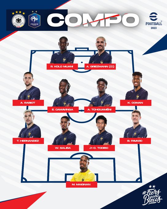Le 1️⃣1️⃣ qui va débuter contre l'Allemagne 👊 Coup d'envoi à 21h00 sur @TF1 📺 🇩🇪🇫🇷 #ALLFRA | #FiersdetreBleus