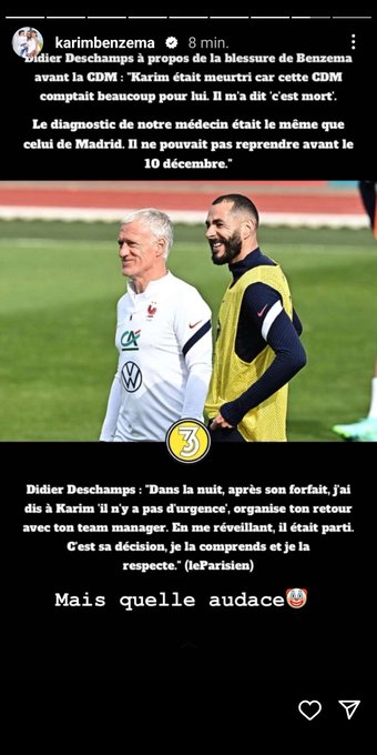 départ de KB9 du Qatar, le samedi 19 novembre après des examens médicaux, DD a donné sa version des faits, mais visiblement Karim Benzema était à l’affût et sa réponse a été foudroyante.