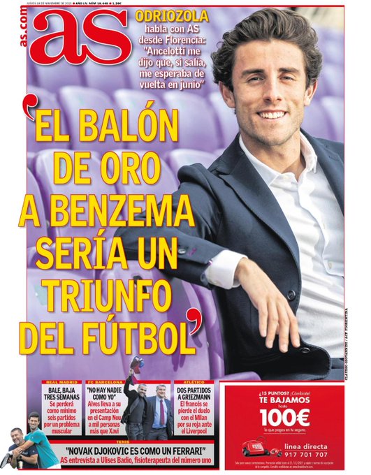 « J'ai toujours été très Benzemista, bien avant de jouer avec un footballeur magnifique comme lui. Je le vois dans le meilleur moment de sa carrière. Quand vous avez un joueur à vos côtés qui vous marque 50 buts, l'accent sera toujours mis sur ce joueur, mais Karim avait déjà très bien réussi lors de l'étape avec Cristiano. Sans Benzema, je suis sûr que Cristiano aurait marqué beaucoup moins de buts. Après son départ, Karim a pris le relais, se sentant plus protagoniste, se sentant comme la star du Real Madrid, et maintenant, en plus de faire jouer l'équipe, il marque de nombreux buts. Pour moi, le Ballon d'Or serait un triomphe footballistique s’il lui est accordé car il le mérite vraiment, non seulement pour cette année, mais pour toutes les précédentes où il a joué un football magnifique, développe l'ancien joueur de la Real Sociedad. De plus, c'est une très grande personne. Il a beaucoup souffert personnellement et a toujours continué à travailler, à se battre. Donc mon vote est pour lui », complimenté Alvaro Odriozola qui aurait pu faire gagner des votes à KB9 s’ils n’étaient pas bouclés, tant il se montre convaincant. Fin du suspens le 29 novembre donc avec une cérémonie au Théâtre du Châtelet, à Paris.