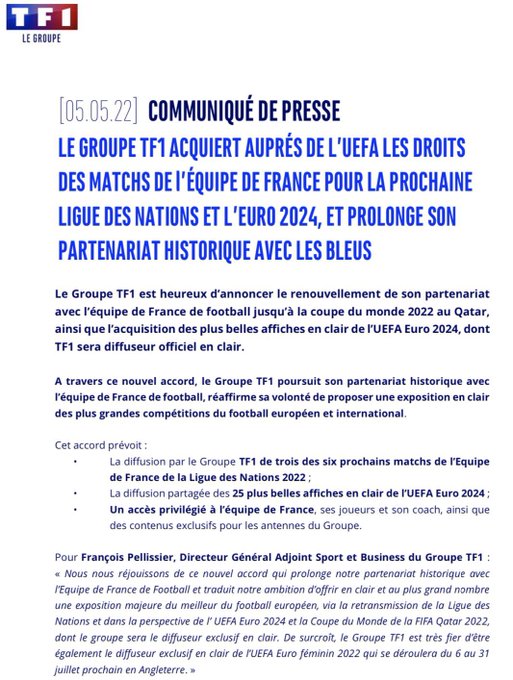 .@TF1 prolonge son partenariat historique avec les Bleus 🔵 On vous donne rendez-vous pour la Ligue des Nations 2022 et l’Euro 2024 🇫🇷 Notre aventure avec l’Equipe de France se poursuit !
