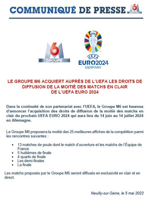 #EVENEMENT ⚽️Le Groupe M6 acquiert auprès de l'#UEFA les droits de diffusion de la moitié des matchs en clair de l'#Euro2024