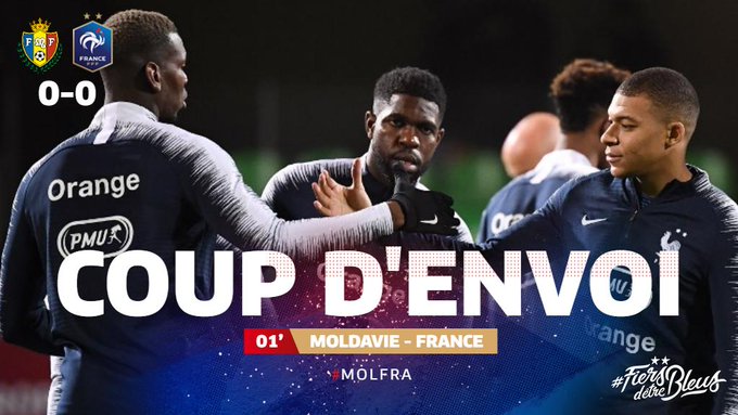 C'est parti ! Avec un changement de dernière minute : Blaise Matuidi remplace Kingsley Coman au milieu de terrain 🇲🇩🇫🇷 #MOLFRA #FiersdetreBleus