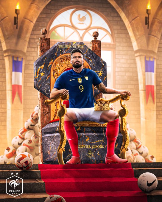 𝑆𝑒𝑢𝑙 𝑠𝑢𝑟 𝑠𝑜𝑛 𝑡𝑟𝑜̂𝑛𝑒 👑 Ouverture du score des Bleus à la 44e minute !! 😍 Grâce à ce but, @OlivierGiroud devient le 𝙈𝙀𝙄𝙇𝙇𝙀𝙐𝙍 𝘽𝙐𝙏𝙀𝙐𝙍 de l’histoire de l’Équipe de France 🇫🇷 🇫🇷1-0🇵🇱 #FRAPOL | #FiersdetreBleus