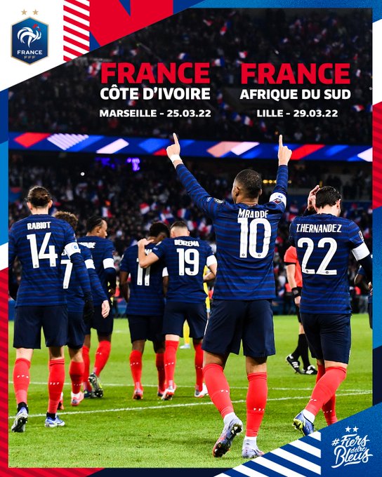 Les Bleus joueront 2️⃣ matchs amicaux à domicile le mois prochain ! 📆 25/03 : 🇫🇷🇨🇮 à Marseille 📆 29/03 : 🇫🇷🇿🇦 à Lille #FiersdetreBleus