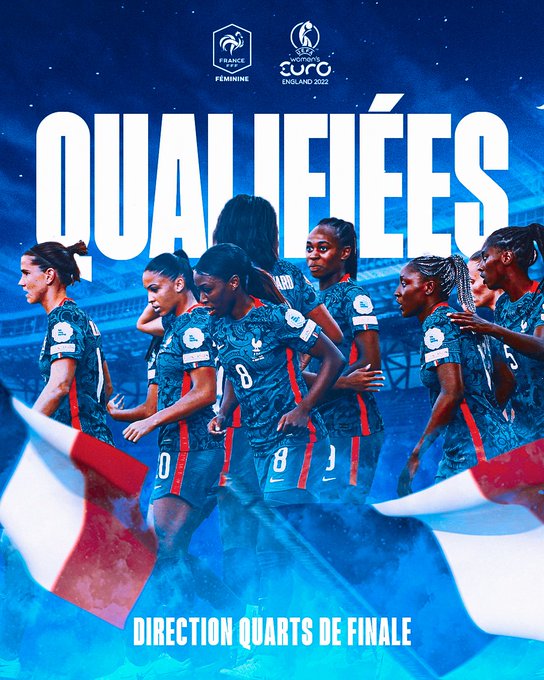 𝙌𝙪𝙖𝙡𝙞𝙛𝙞𝙚́𝙚𝙨 𝙥𝙤𝙪𝙧 𝙡𝙚𝙨 𝙦𝙪𝙖𝙧𝙩𝙨 𝙙𝙚 𝙛𝙞𝙣𝙖𝙡𝙚 ✅ Après sa victoire face à la Belgique 2⃣-1⃣, les Bleues sont dores et déjà qualifiées pour la suite de la compétition 🔥 #FiersdetreBleues #WEURO2022