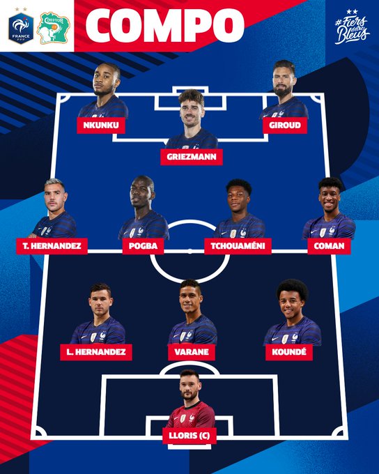 👥 La compo de nos Bleus pour affronter la Côte d'Ivoire 🇨🇮 ⏰ Début du match à 21h15 sur @M6 📺 #FRACIV #FiersdetreBleus