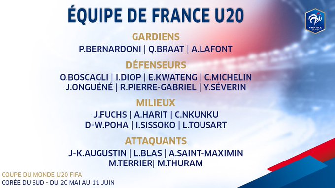 On connaît les 21 Bleuets qui participeront à la Coupe du Monde U20 à partir du 20 mai en Corée du Sud! 👊🇫🇷 ➡️goo.gl/mjHkne