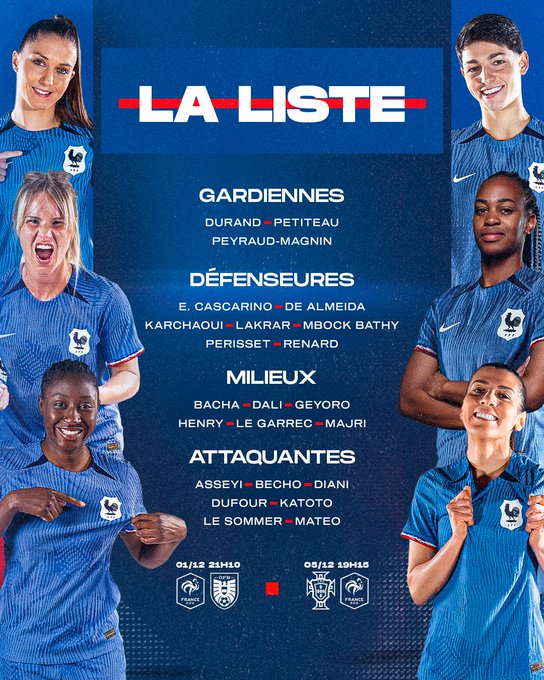 🚨 La liste des 𝐁𝐥𝐞𝐮𝐞𝐬 pour le dernier rassemblement de 𝟐𝟎𝟐𝟑 avec le retour de @MarieKatoto 🔥 Au programme en 𝐋𝐢𝐠𝐮𝐞 𝐝𝐞𝐬 𝐍𝐚𝐭𝐢𝐨𝐧𝐬 : 🇫🇷-🇦🇹 01/12 🇵🇹-🇫🇷 05/12 #FiersdetreBleues