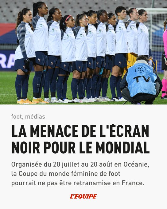 Ecran noir sur la prochaine coupe du monde féminine ? Cette menace devient sérieuse comme le titre l'Equipe dans un article. Le tournoi mondial qui regroupera pour la première fois 32 pays, du 20 juillet au 20 août prochain, aura lieu en Australie et en Nouvelle-Zélande. Mais, pour le moment, aucune chaine n'en a obtenu la diffusion en France et dans les quatre autres grands pays européens : Angleterre, Allemagne, Espagne, Italie.