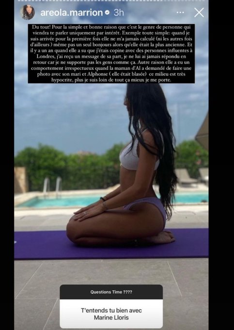 « Du tout ! Pour la simple et bonne raison que c’est le genre de personne qui viendra te parler uniquement par intérêt. Exemple : quand je suis arrivée à Londres, elle ne m’a pas calculée, même pas un seul bonjour, alors qu’elle était la plus ancienne. Et il y a un an, quand elle a su que j’étais copine avec des personnes influentes à Londres, j’ai reçu un message de sa part. Je n’ai jamais répondu car je ne supporte pas les gens comme ça. Autre raison, elle a eu un comportement irrespectueux quand la maman d’Al a demandé de faire une photo avec son mari et Alphonse (elle était blasée). Ce milieu est très hypocrite. Plus je suis loin de tout ça, mieux je me porte », a balancé Marrion Aréola sur les réseaux sociaux.