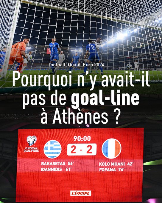 Pas de goal-line technology lors de Grèce-France : pour l'UEFA, une politique à géométrie variable Obligatoire dès la phase de groupes en C1 et en C3, la technologie sur la ligne de but ne l'est pas pour les qualifications à l'Euro ow.ly/7hPn50QanJF