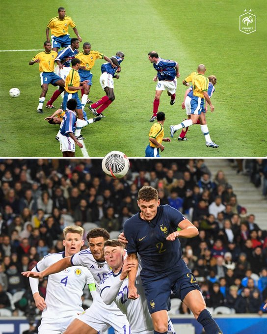 𝟐𝟓 𝒂𝒏𝒔 𝒂𝒑𝒓𝒆̀𝒔 ⌛️ @BenPavard28 est le 1er joueur à marquer un 𝒅𝒐𝒖𝒃𝒍𝒆́ 𝒅𝒆 𝒍𝒂 𝒕𝒆̂𝒕𝒆 avec la France depuis un certain... Zinédine Zidane en 98 🤩 #FRAECO | #FiersdetreBleus