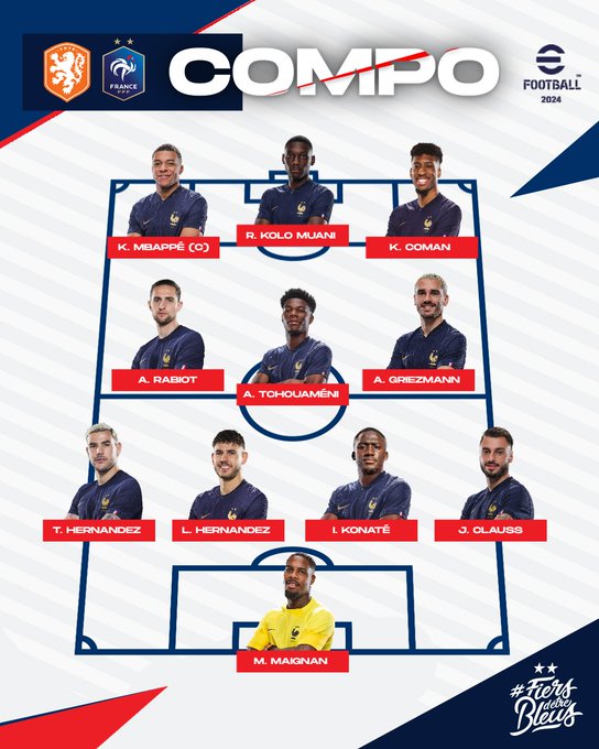 L'équipe qui va débuter face aux Pays-Bas 👊 🔜 Coup d'envoi 20h45 sur @TF1 #PBSFRA | #FiersdetreBleus
