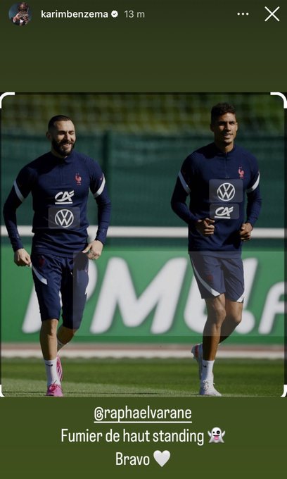 Dans une story Instagram, le Ballon d’Or 2022 a publié une photo d’un entraînement en Bleu où l’on voit Benzema et Varane et a écrit : «Fumier de haut standing, bravo». Sur la publication du vainqueur de la Coupe du Monde 2018 avec la France, Benzema en a même rajouté une couche : «Bravo mon fumier, t’es le best», a-t-il également commenté. Un hommage rare tant KB9 ne prend pas souvent la parole sur les réseaux, et a parfois du mal à avoir, du moins publiquement, une pensée pour ses anciens coéquipiers.